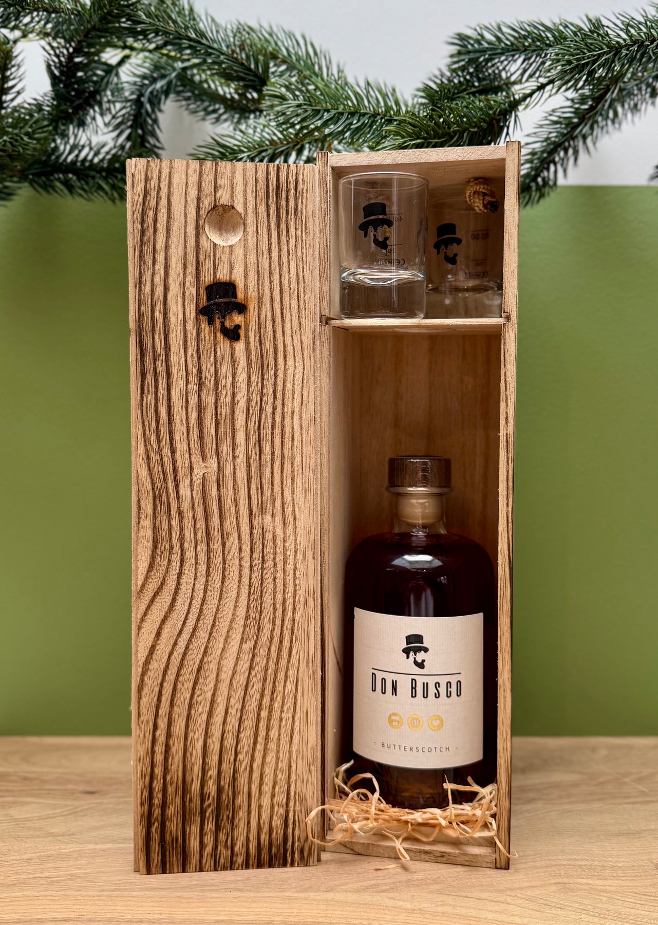 Das Don Busco Geschenkset mit zwei Don Shot Gläschen in einer Holzkiste, welche durch uns handmade das einzigartige flamed Design inkl. Don Branding verpasst bekommt, ist das perfekte Geschenk für jeden Anlass.